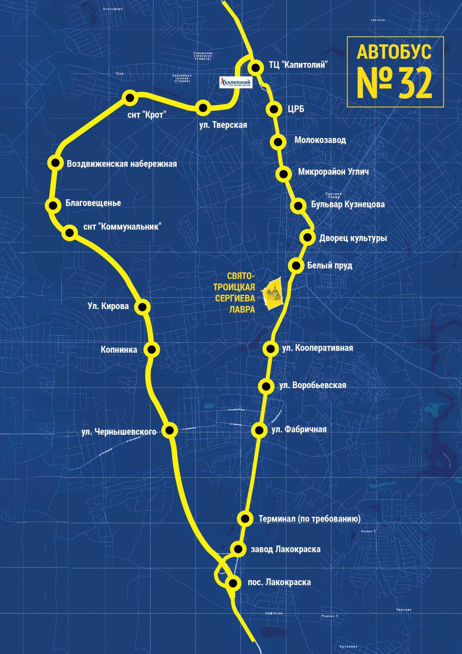 По поручению МТДИ МО с 26.11.2019 г. часть рейсов автобуса №32 "Сергиев Посад (Вещевой рынок) – 67 км" будет организована по "Западному шоссе".