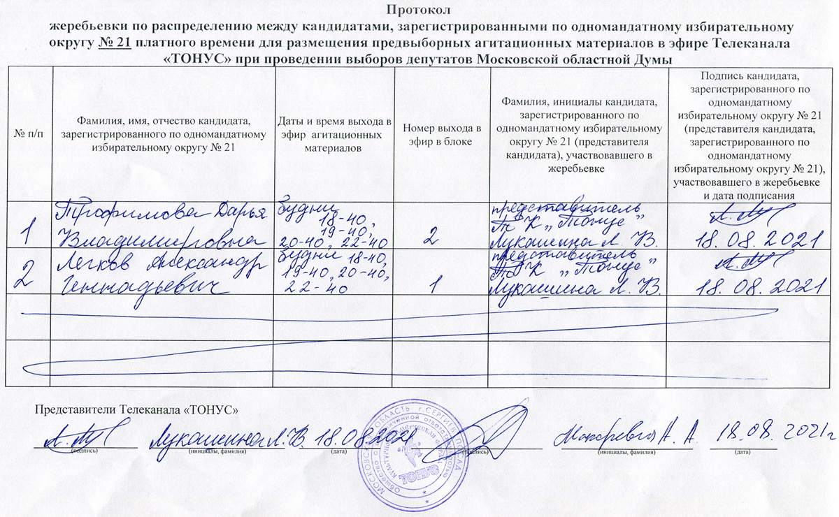 18 августа 2021 года прошла жеребьёвка по распределению между кандидатами, зарегистрированными по одномандатному избирательному округу № 21 платного времени для размещения предвыборных агитационных материалов в эфире Телеканала «ТОНУС» при проведении выборов депутатов Московской областной Думы.