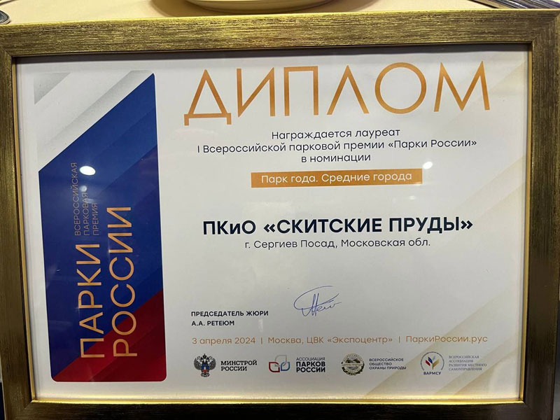 Также парк «Скитские пруды» стал лауреатам I Всероссийской парковой премии «Парки России» в номинации «Парк года. Средние города».
