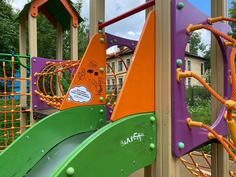 Также жители пожаловались на граффити на детском городке у д. 3 в Новом переулке. Наклейки с датой устранения информируют о завершении работ 15 июня.