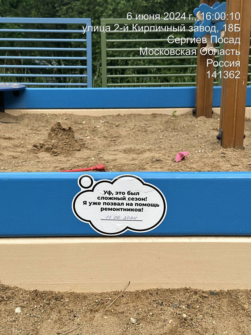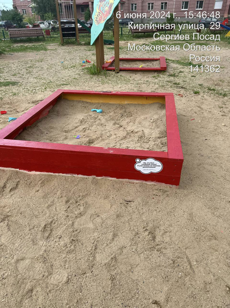 Администрация Сергиево-Посадского городского округа сообщает, что на этой неделе обращения наполнить песочницы песком поступили от жителей д. 29 по ул. Кирпичная и д. 12-14 по Скобяному шоссе.