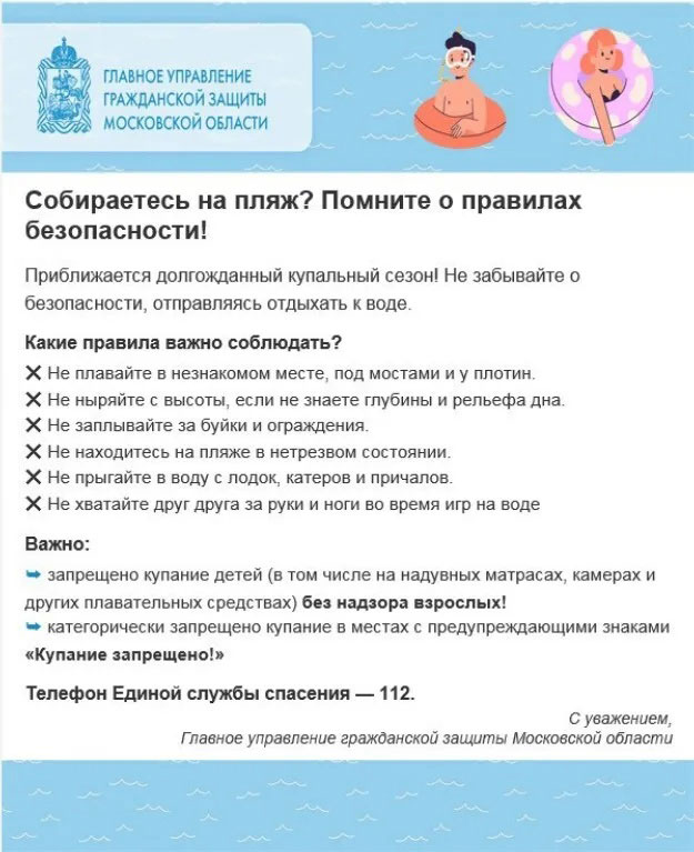 Управление ГО и ЧС администрации Сергиево-Посадского округа предупреждает о необходимости соблюдать правила безопасности на водоёмах.
