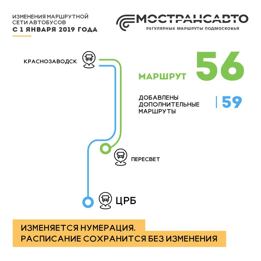 Автобус №56 «Краснозаводск – Пересвет», который обслуживает автоколонна №1791 «Мострансавто», имеет две конечных остановки — ЦРБ в Сергиевом Посаде и Пересвет. Выделен добавочный №59, следующий по маршруту «Краснозаводск – ЦРБ».