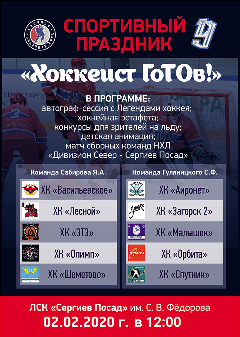 2 февраля в 12:00 в ледовом комплексе «Сергиев Посад» имени С.В. Фёдорова стартует спортивный праздник «Хоккеист ГоТОв», в рамках которого игроки посоревнуются в хоккейном мастерстве. Лучшие хоккеисты конференции «Север» дивизиона 18+ Ночной хоккейной лиги Московской области образуют две сборные команды, названные в честь известных загорских тренеров: «команда Сабирова» и «команда Гуляницкого». Коллективы поборются за главный трофей состязаний.