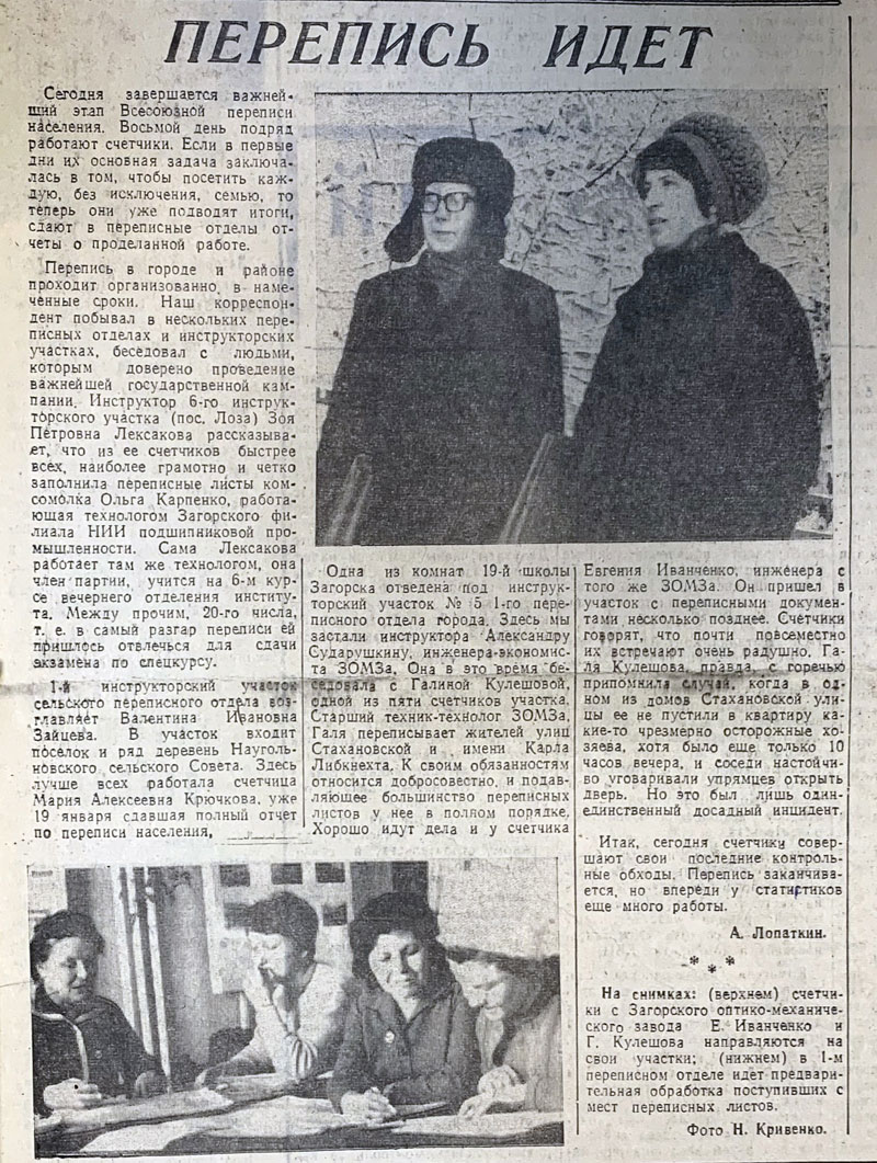 В Загорске и районе были организованы восемь переписных отделов, которые подразделялись на инструкторские и счетные участки. Всего было создано 57 инструкторских и 270 счетных участков. В событии государственного масштаба было занято более 500 человек.