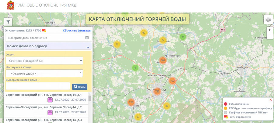 В специальном меню можно ввести адрес дома и узнать сроки отключения воды. На карте появляется цветовой индикатор, указывающий на конкретный дом, который позволит узнать, есть ли сложности с графиком отключения. Масштабируя карту, можно увидеть сколько отключений планируется всего, в каких районах сколько домов отключено или ожидает отключения горячей воды.