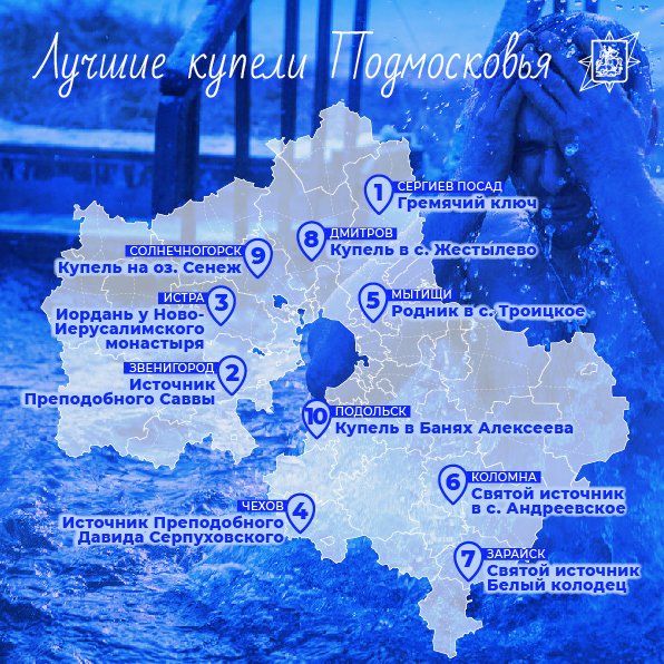 В ночь на 19 января многие по традиции отправятся купаться в проруби и источники – считается, что окунувшись трижды можно избавиться от болезней и очиститься от грехов. Более 200 площадок для купания оборудовано в городских округах Подмосковья, сообщает Главное управление МЧС по Московской области. Комитет по туризму МО подготовил карту, на которой отметил 10 лучших оборудованных мест, где можно будет окунуться. Турпортал Правительства МО Welcome.mosreg.ru в подробностях рассказал о главных купелях региона и ключевых правилах безопасности.