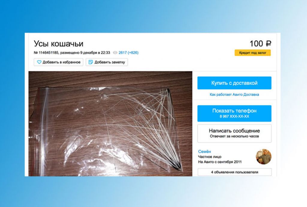 В понедельник на сайте Avito появилось объявление о продаже кошачьих усов (вибриссов) по 50 рублей за штуку. В описании товара говорится, что усы натуральные, "из кота не выдергивали".
